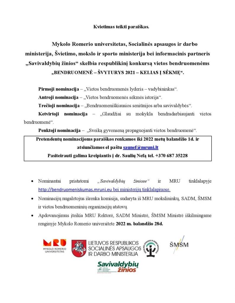Mykolo Romerio universitetas, Socialinės apsaugos ir darbo ministerija, Švietimo, mokslo ir sporto ministerija bei informacinis partneris „Savivaldybių žinios“ skelbia respublikinį konkursą vietos bendruomenėms „BENDRUOMENĖ – ŠVYTURYS 2021 – KELIAS Į SĖKMĘ“.