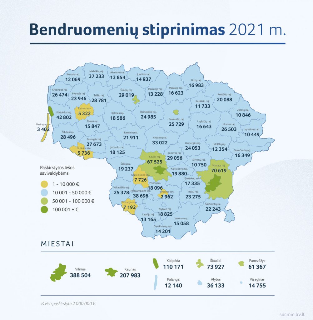 Savivaldybių organizuojamiems vietos bendruomenių stiprinimo projektams 2021 metams Socialinės apsaugos ir darbo ministerija skyrė 2 mln. 180 tūkst. eurų. Dešimtyje savivaldybių bus įgyvendinamas bandomasis projektas – savivaldybėms pagalbą teiks konsultantas. Tikimasi, kad tai paskatins vietos bendruomenes imtis ambicingesnių projektų, naudingų vietos gyventojams.