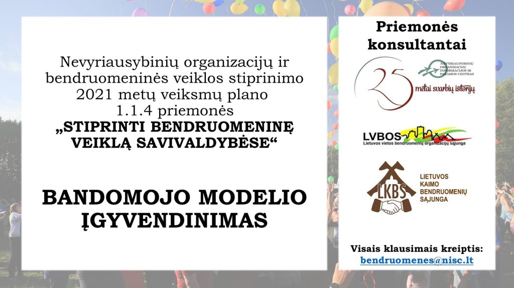 Todėl šiais metais Nevyriausybinių organizacijų informacijos ir paramos centras kartu su partneriais Lietuvos vietos bendruomeninių organizacijų sąjunga ir Lietuvos kaimo bendruomenių sąjunga, bendradarbiaudami su dešimt Lietuvos savivaldybių (Anykščių r., Elektrėnų r., Kaišiadorių r., Kauno m., Kėdainių r., Klaipėdos m., Klaipėdos r., Panevėžio m., Tauragės r., Trakų r.) ir Socialinės apsaugos ir darbo ministerija, pirmą kartą sėkmingai įgyvendina bandomąjį bendruomeninių organizacijų projektų rėmimo modelį, pagal kurį konkurse galėjo dalyvauti išimtinai tik gyvenamosios vietos bendruomenių organizacijos. Pasak Nevyriausybinių organizacijų informacijos ir paramos centro direktorės Olgos Žuravliovos, „pirmą kartą pasiūlyta konkursinio finansavimo programa, skirta tik gyvenamosios vietos pagrindu susibūrusioms bendruomenėms su gyvenimu kaimynystėje susijusioms iniciatyvoms ir poreikiams remti, t.y. kaimynystei stiprinti. Kitoms nevyriausybinėms organizacijoms, religinėms bendruomenėms kasmet atsiranda naujų galimybių ir finansinių priemonių, todėl šiame modelyje jos galėjo dalyvauti tik kaip vietos bendruomenių partnerės.“